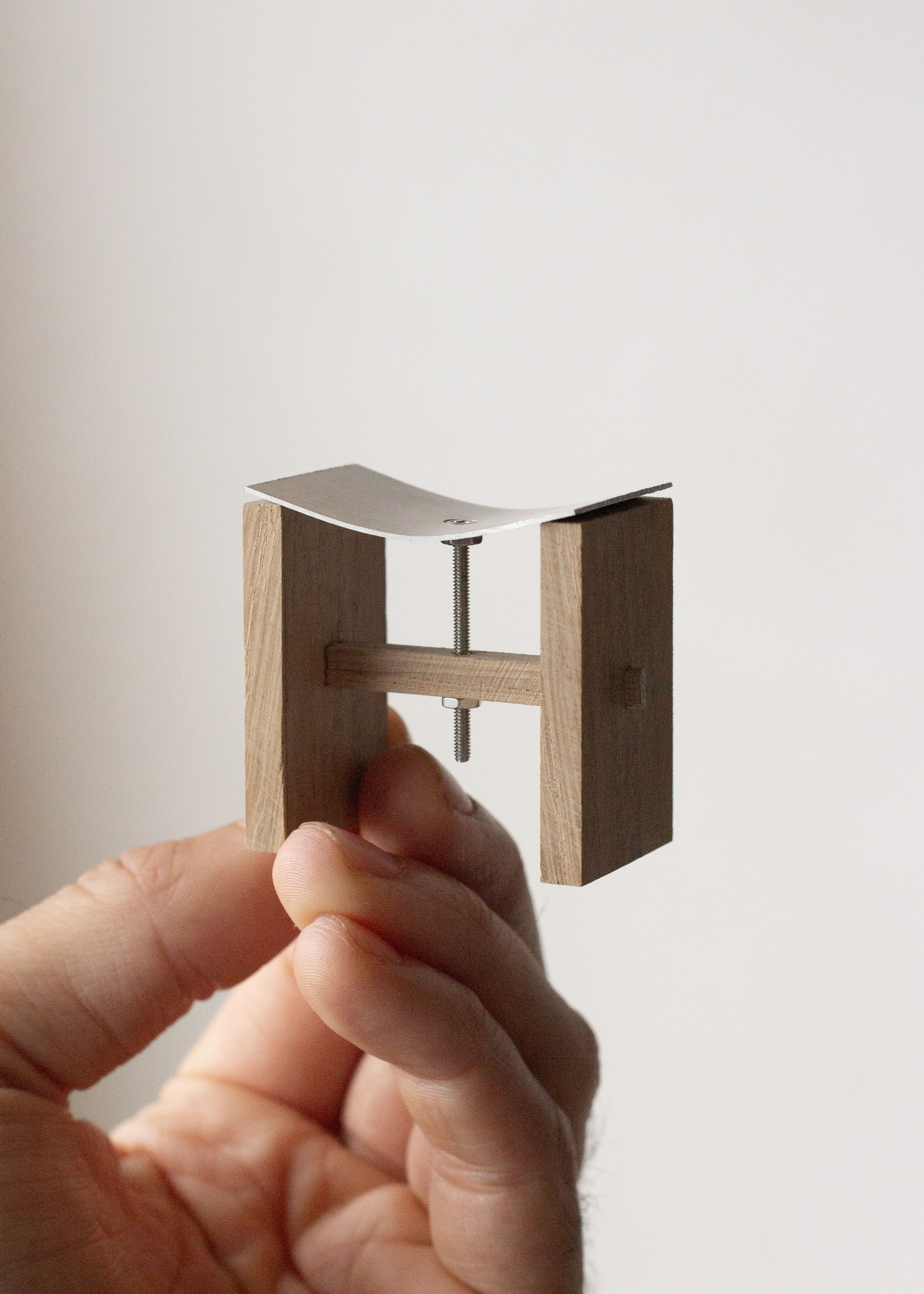 An aluminum sheet is supported by two solid white oak legs joined by an aluminum flat bar. A threaded rod, tightened through the flat bar, bends the sheet into its final form.